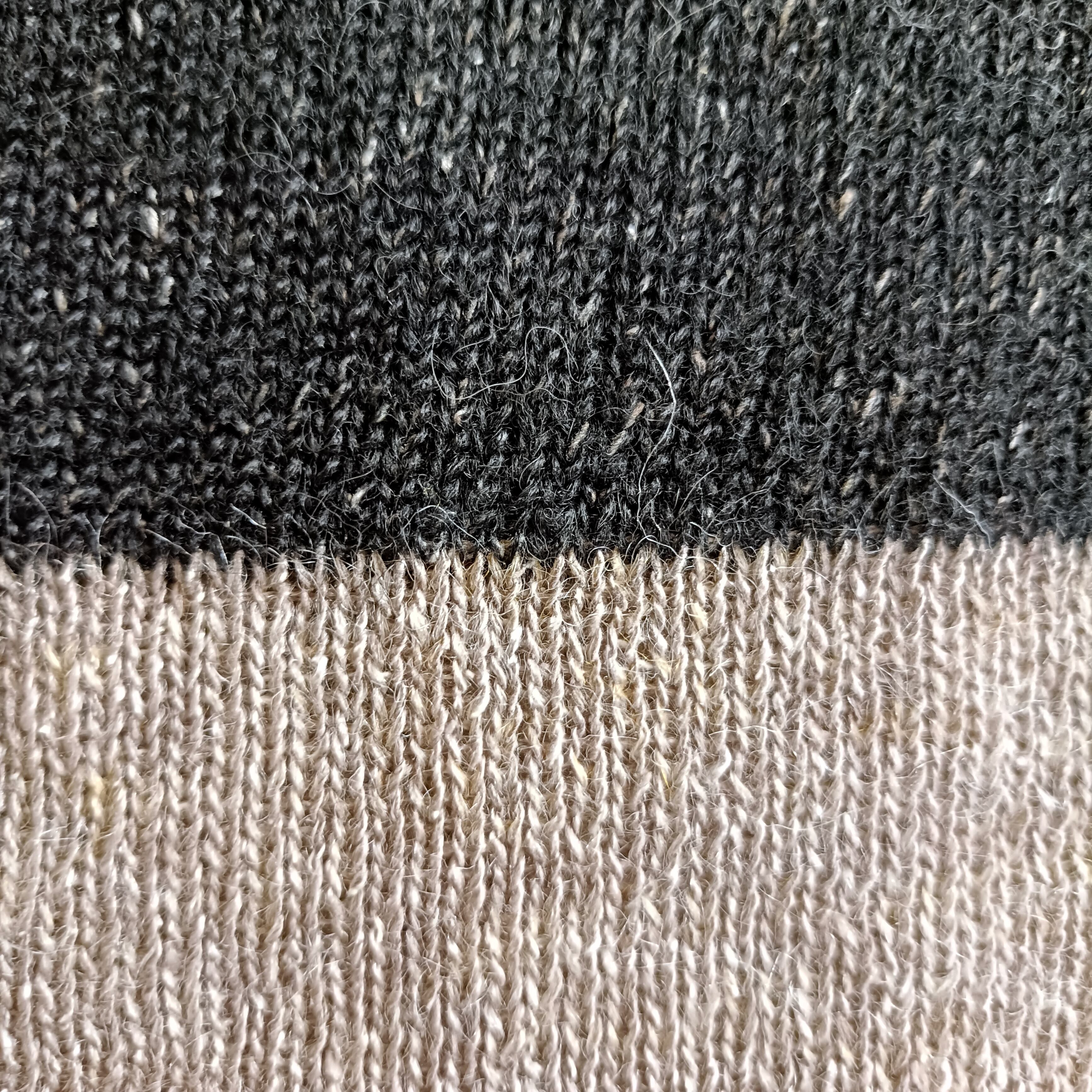ツートンカラーのシンプルなデザイン。異素材のポッケがポイント。紬のシルク糸とキッドモヘアやベビーアルパカを贅沢に合わせて編みました。ボトムス選びに迷わないようにリンクするようにベーシックな色糸をチョイス。ベーシックカラー×ベーシックカラーのブラックと、同じ色合い同士のよく見るとツートンになっているネイビー。暗い色になりがちな季節にきれいな色を取り入れてみませんか?軽くて暖かいのが魅力な商品です。