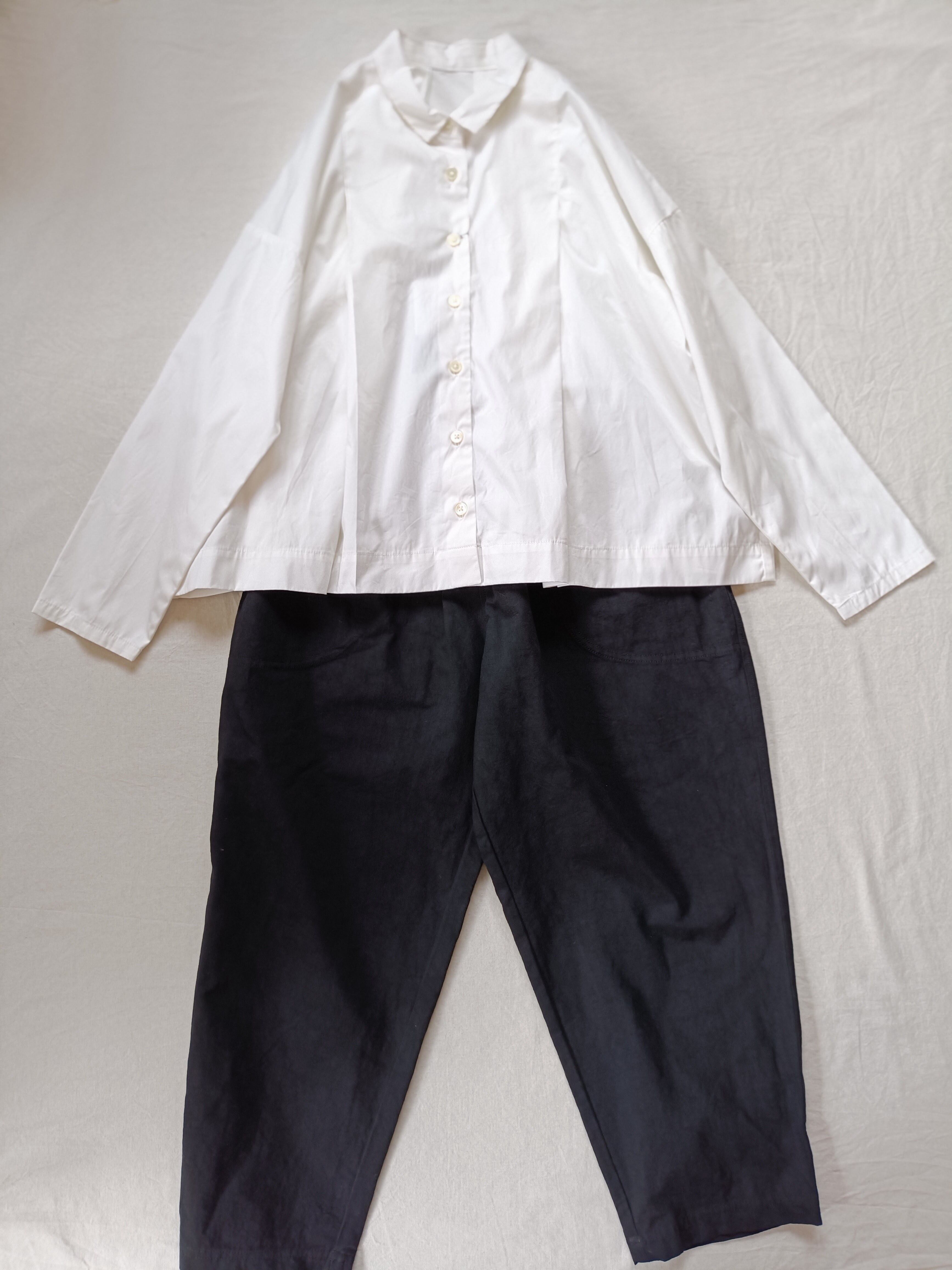 おしりをしっかりホールドしてくれる厚めのシャリ感ある綿麻パンツです。色合わせに困らないブラック、墨色です。おしりあたりはゆったりと、足先向かって細くなるので楽ですがかっこの良いシルエットです。日本製。