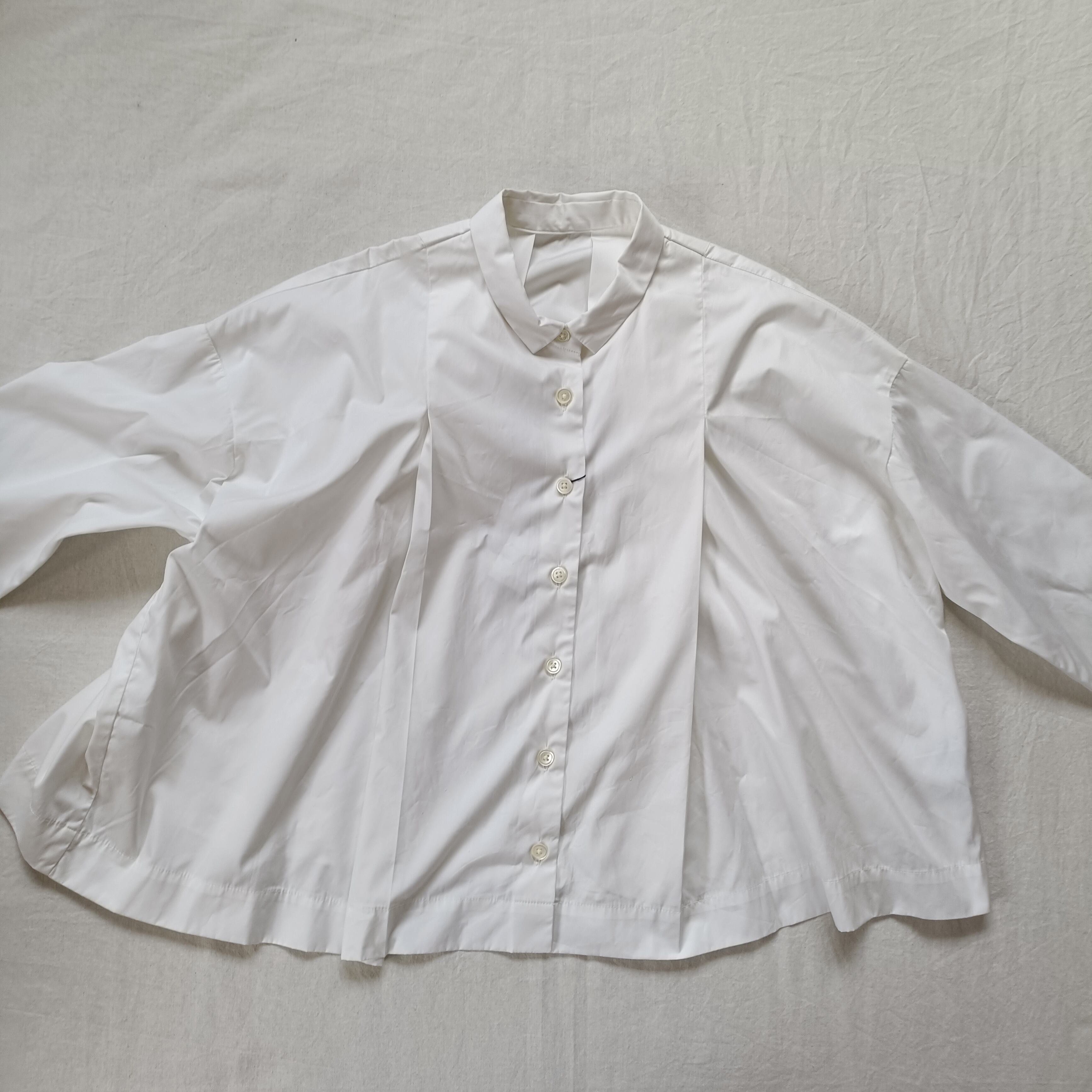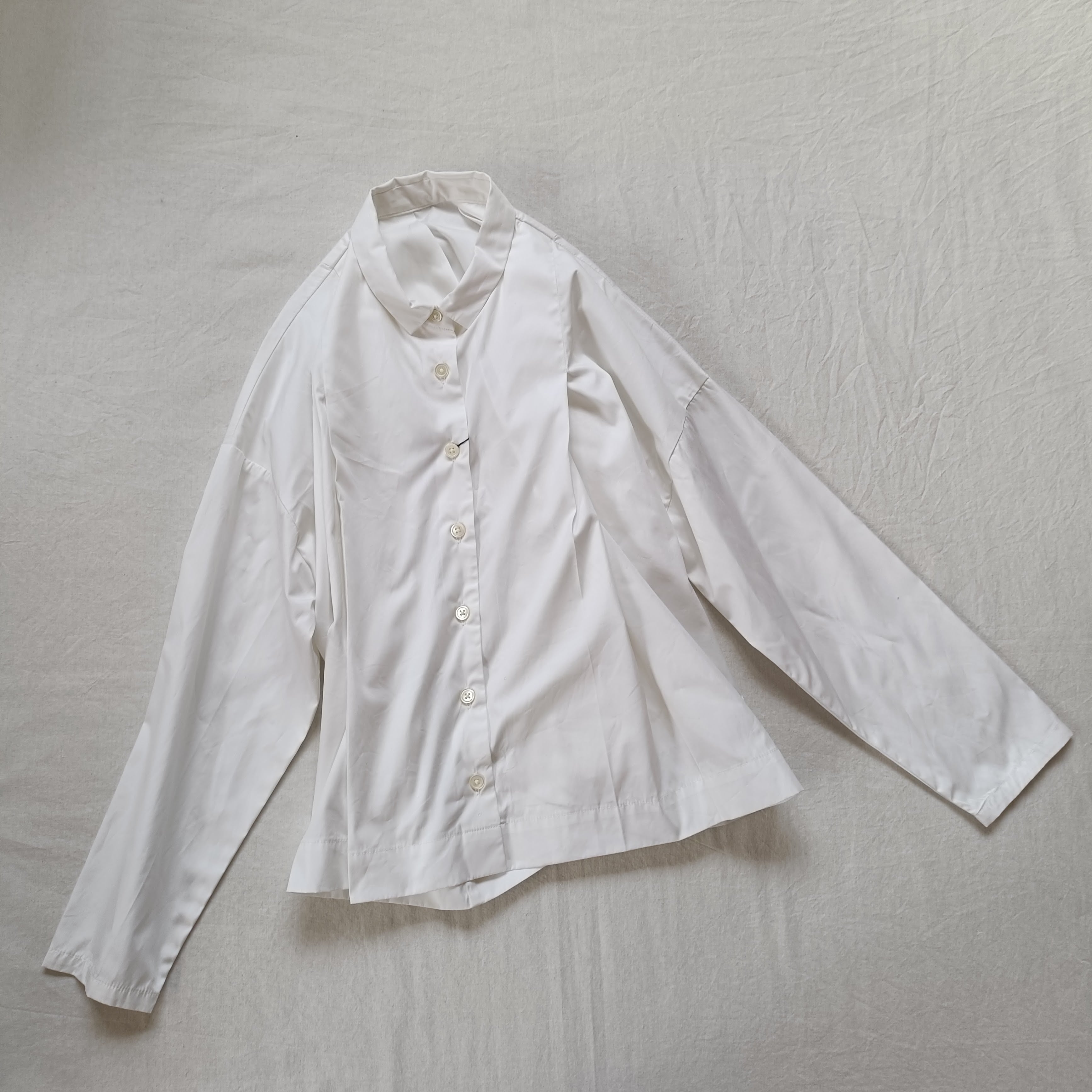 シンプルな白の光沢のある厚めのブラウスです。前にも後ろにも大きめのタックが入っているのでシルエットは細身ですがゆったり着られます。日本製。