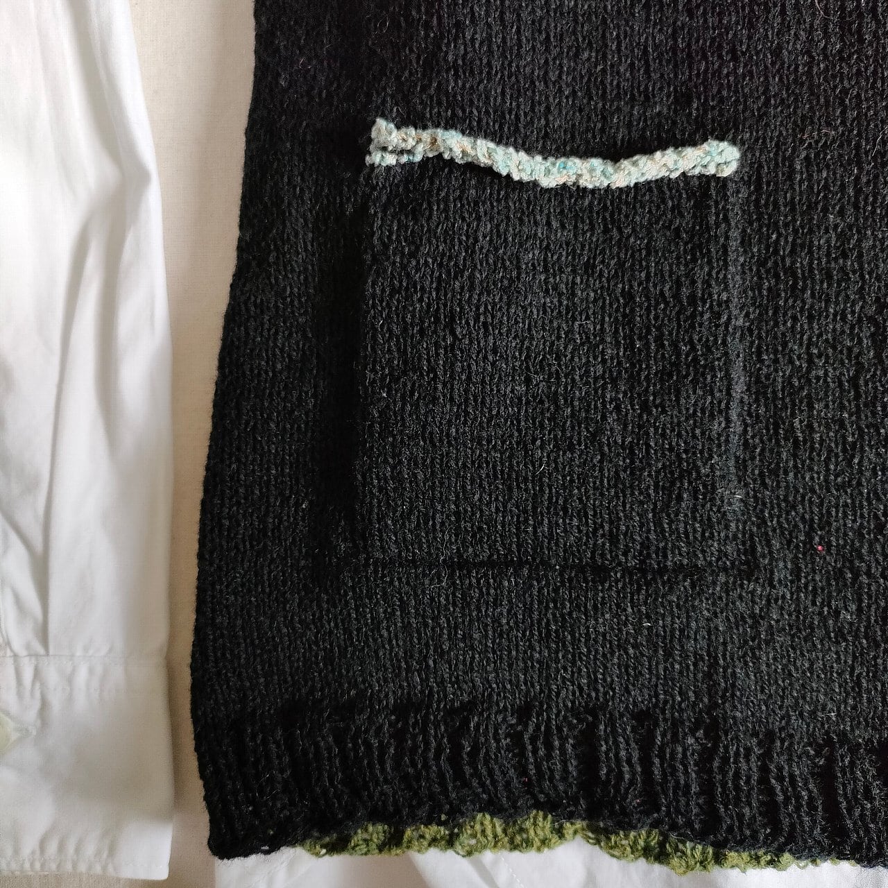 寸法:身幅47、身丈55、首丈2、首回り47、袖口回り38、ポケット2つ